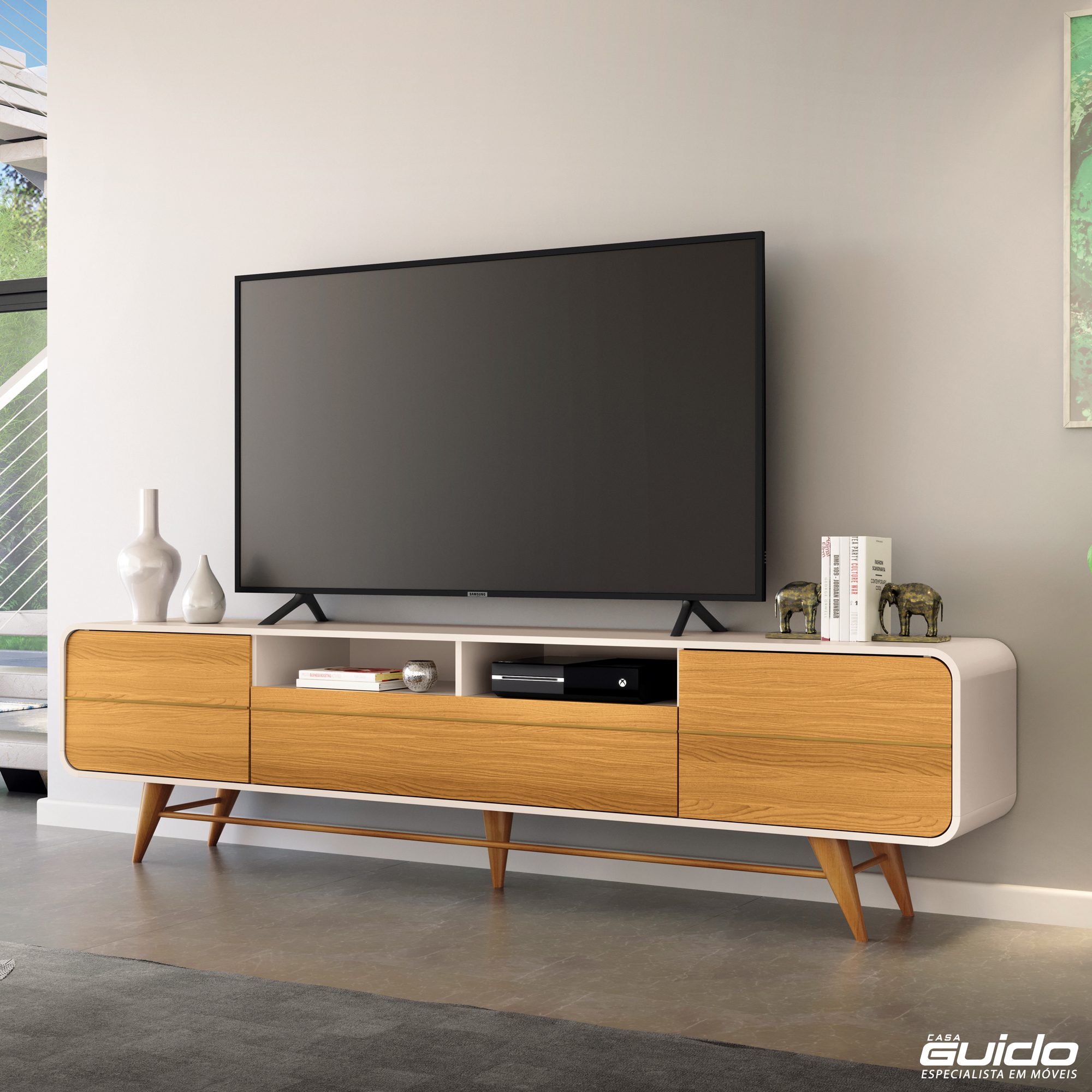 A Bancada HB Época é uma peça elegante e funcional, ideal para acomodar TVs de até 85 polegadas, proporcionando um ambiente sofisticado e moderno. Com seu design contemporâneo e cantos arredondados, ela se destaca em qualquer sala de estar, unindo estilo e praticidade.