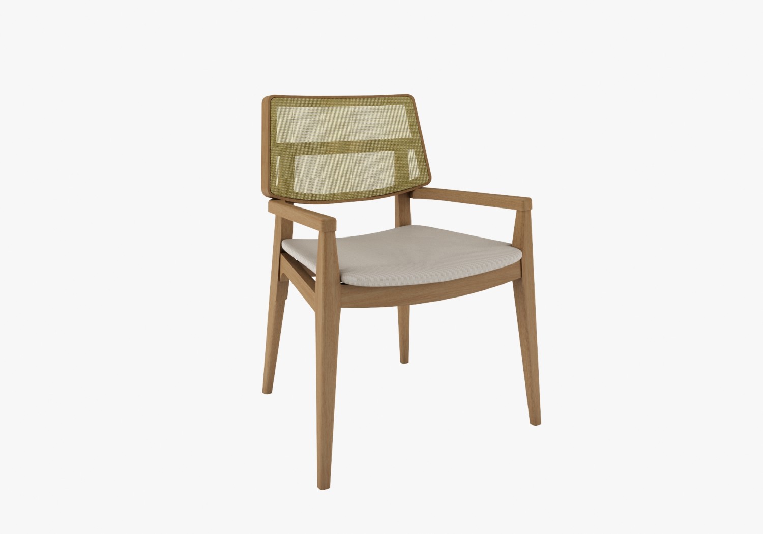 Cadeira em madeira maciça com assento em compensado curvo e estofado, fibra sintética aplicada no encosto curvo da cadeira (melhor ergonomia).
