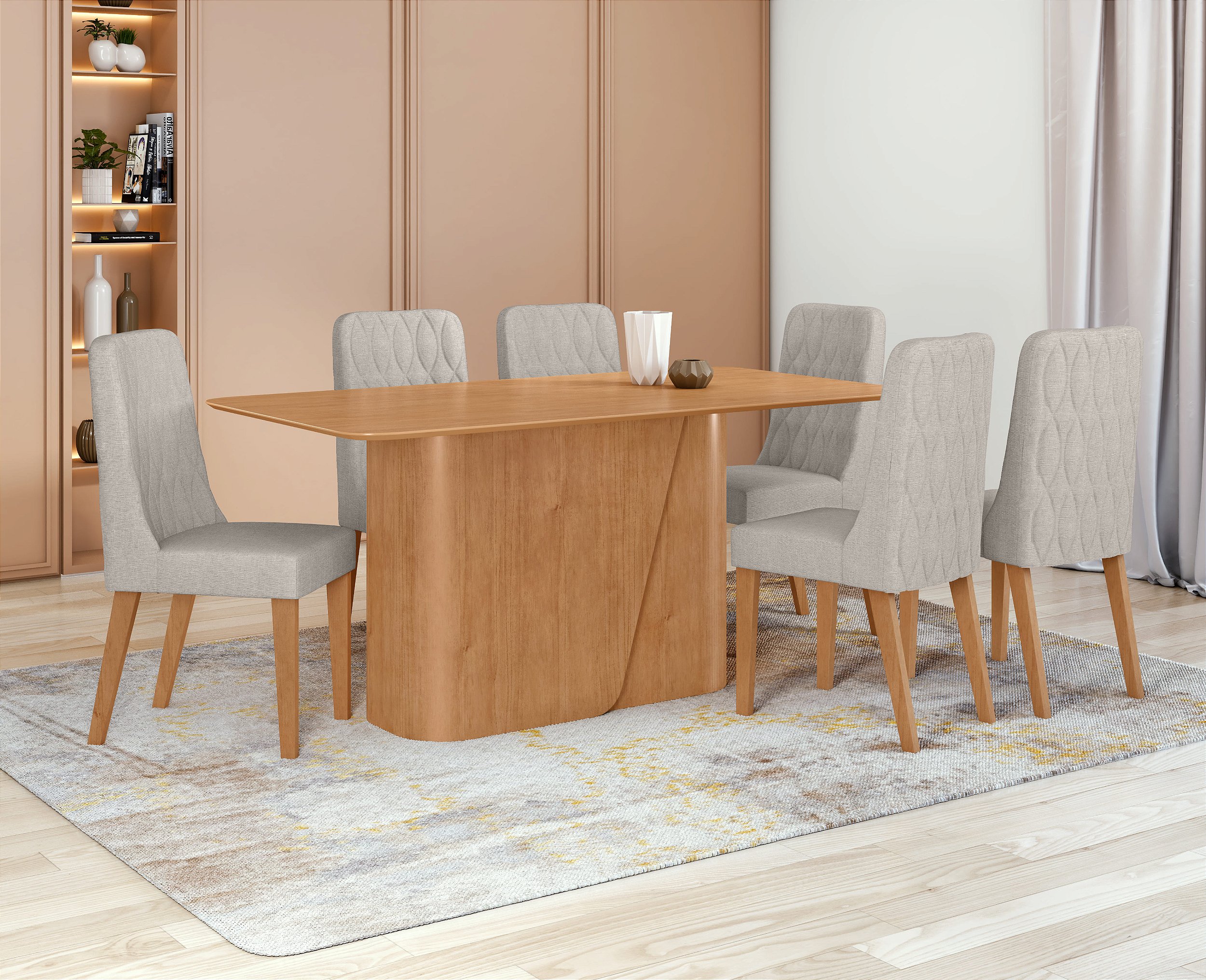 As 6 cadeiras Luar com assentos revestidos em tecido linho cinza (CZ) oferecem conforto e elegância, combinando perfeitamente com o conjunto.