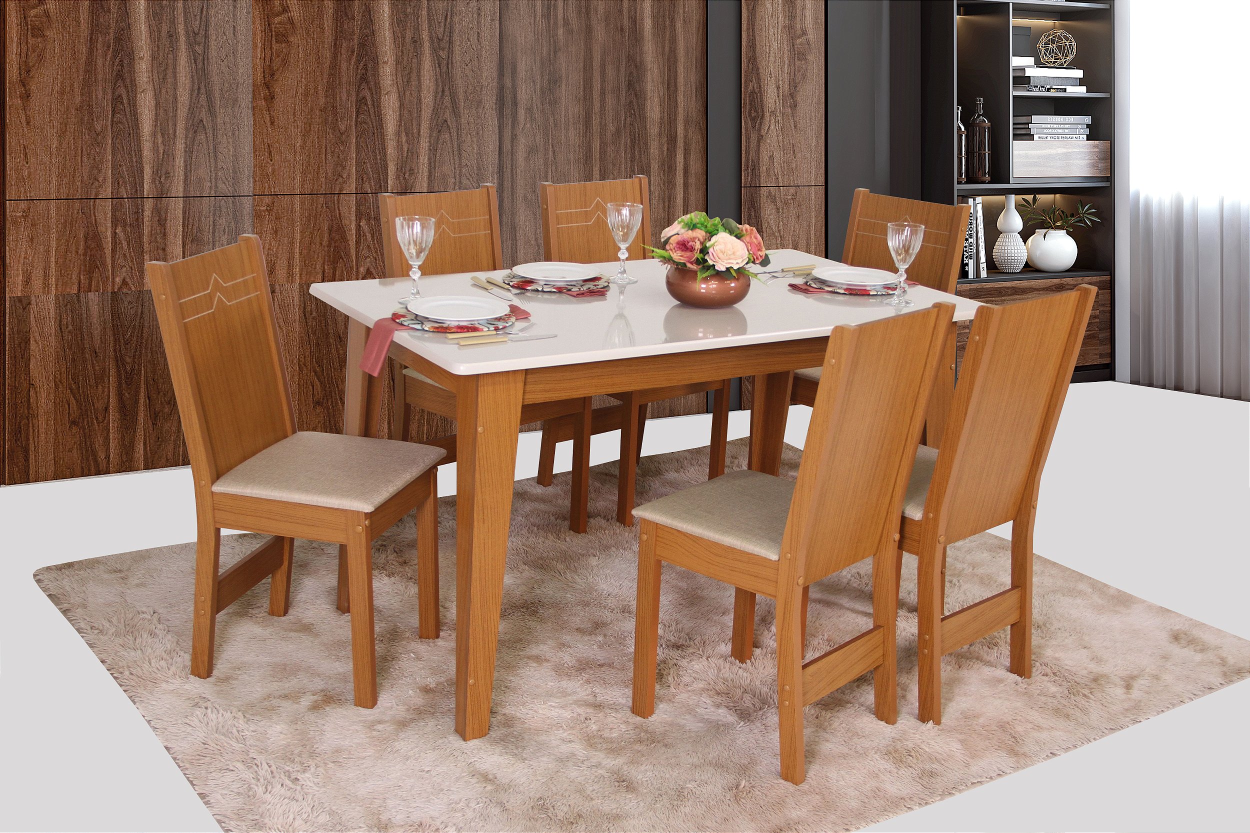 As 6 cadeiras acompanham o conjunto e possuem assento estofado revestido em corino, proporcionando mais conforto durante as refeições, além de facilitar a limpeza e manutenção no dia a dia.