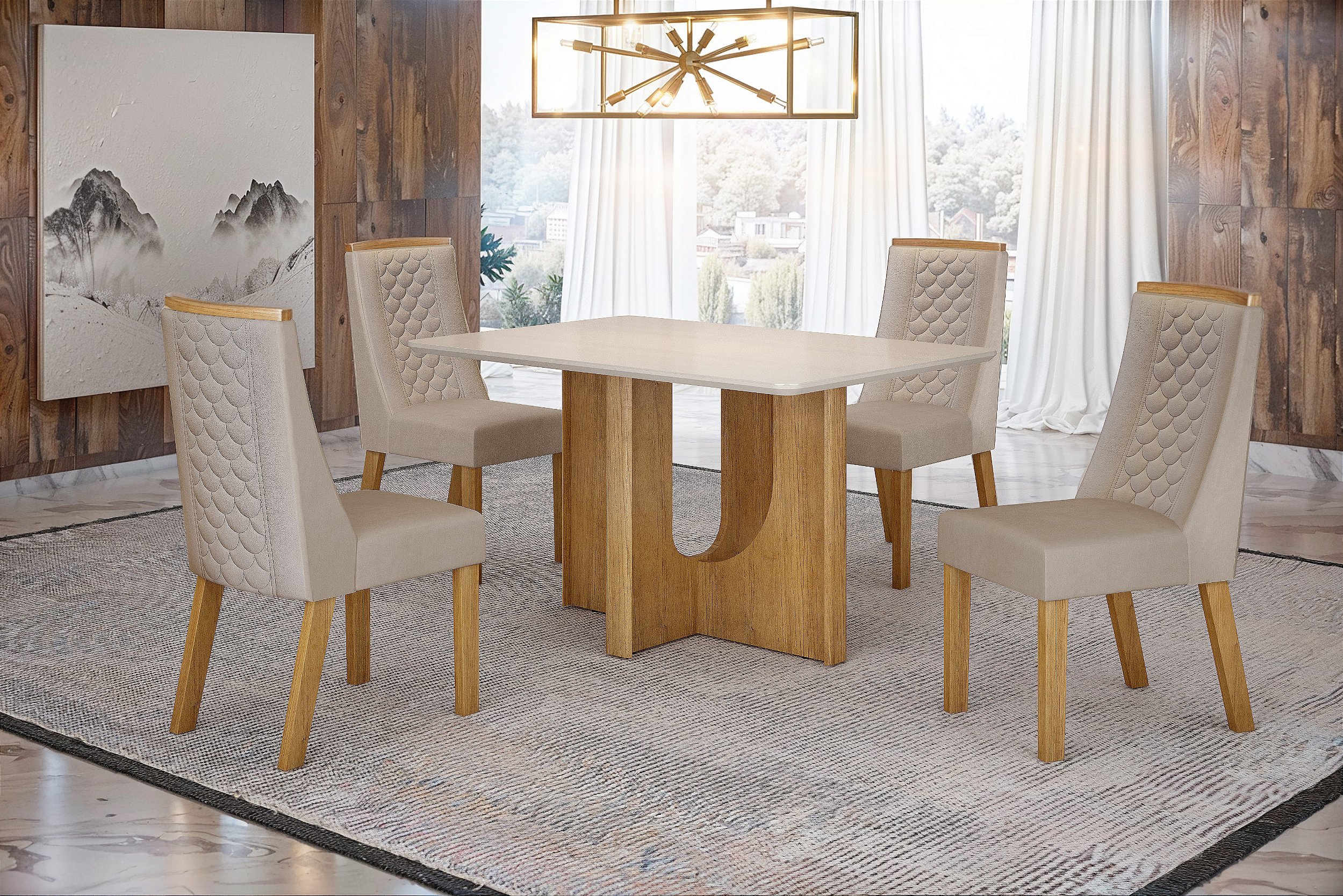 A mesa é robusta e durável, com base em MDF e tampo de 25 mm, oferecendo resistência e segurança. O conjunto acompanha 4 cadeiras estofadas em veludo bege, que trazem conforto e um toque sofisticado ao ambiente.
