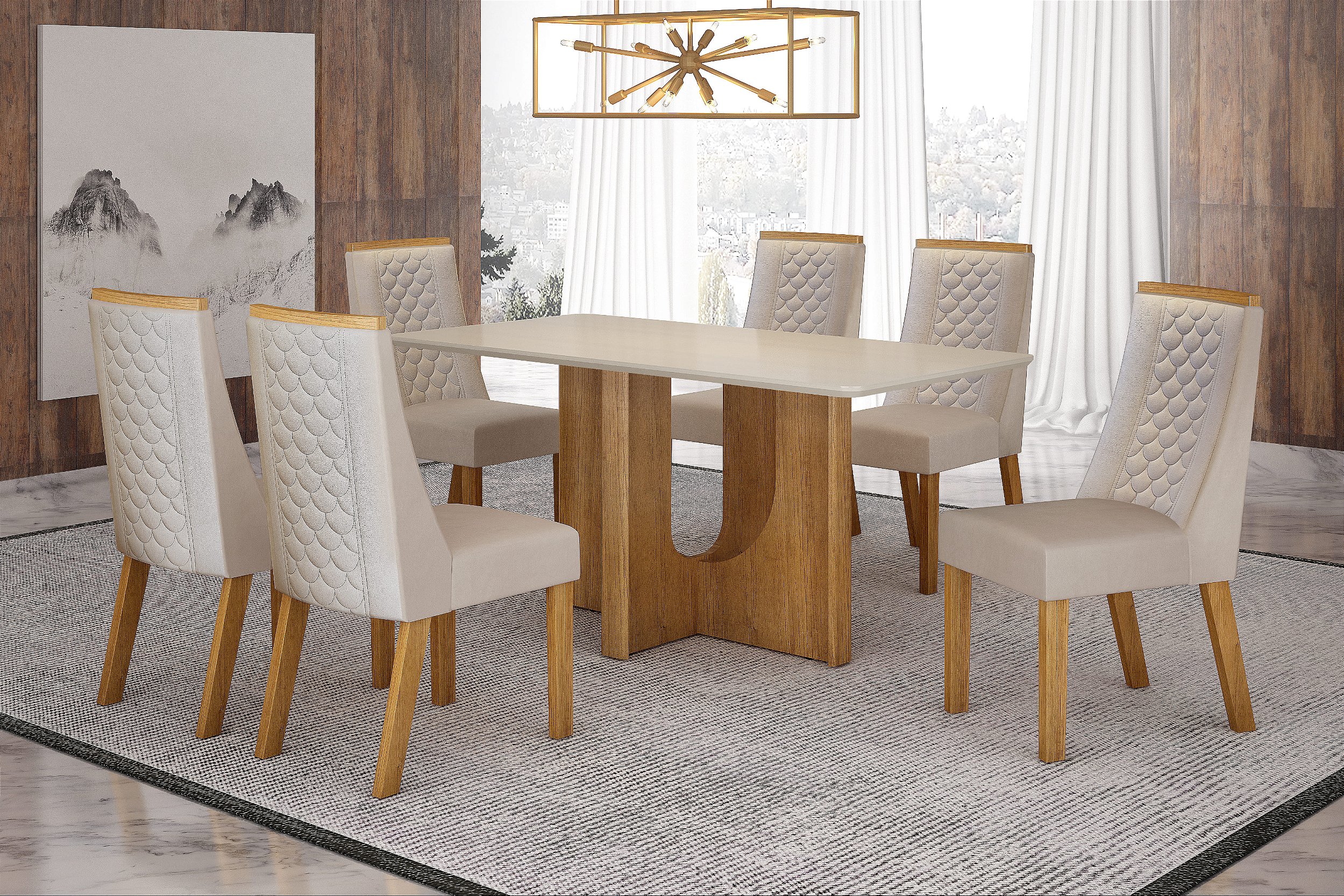 A mesa possui base em MDF e tampo robusto de 25 mm, garantindo resistência e durabilidade. O conjunto acompanha 6 cadeiras estofadas em veludo bege, que oferecem o conforto necessário para refeições prolongadas e agradáveis.
