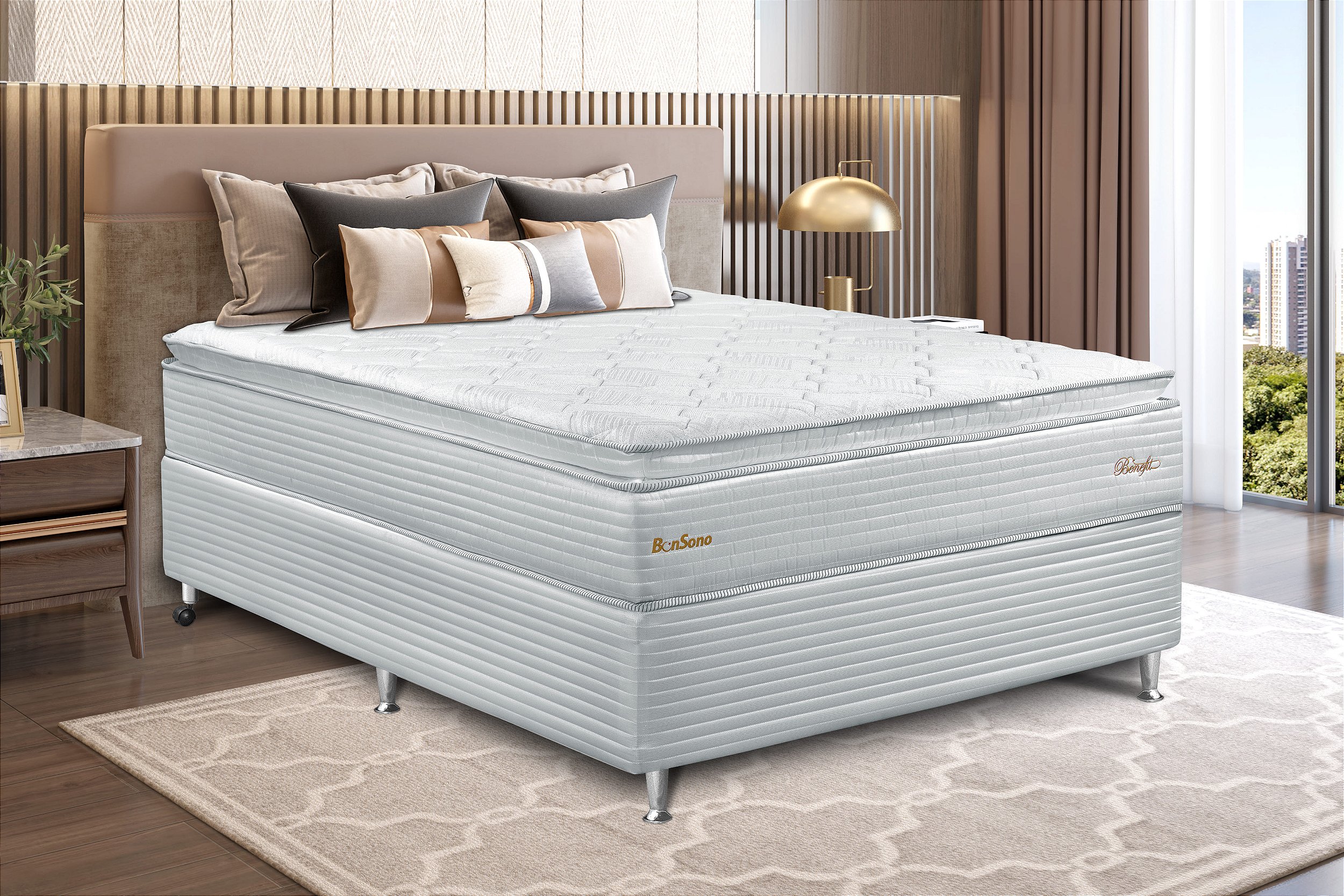 Com 32 cm de altura, o Bonsono Benefit impressiona pelo design robusto e acabamento elegante, sendo ideal para quartos modernos e camas box. Seu revestimento em tecido de alta qualidade é macio ao toque e garante uma sensação aconchegante durante o sono.