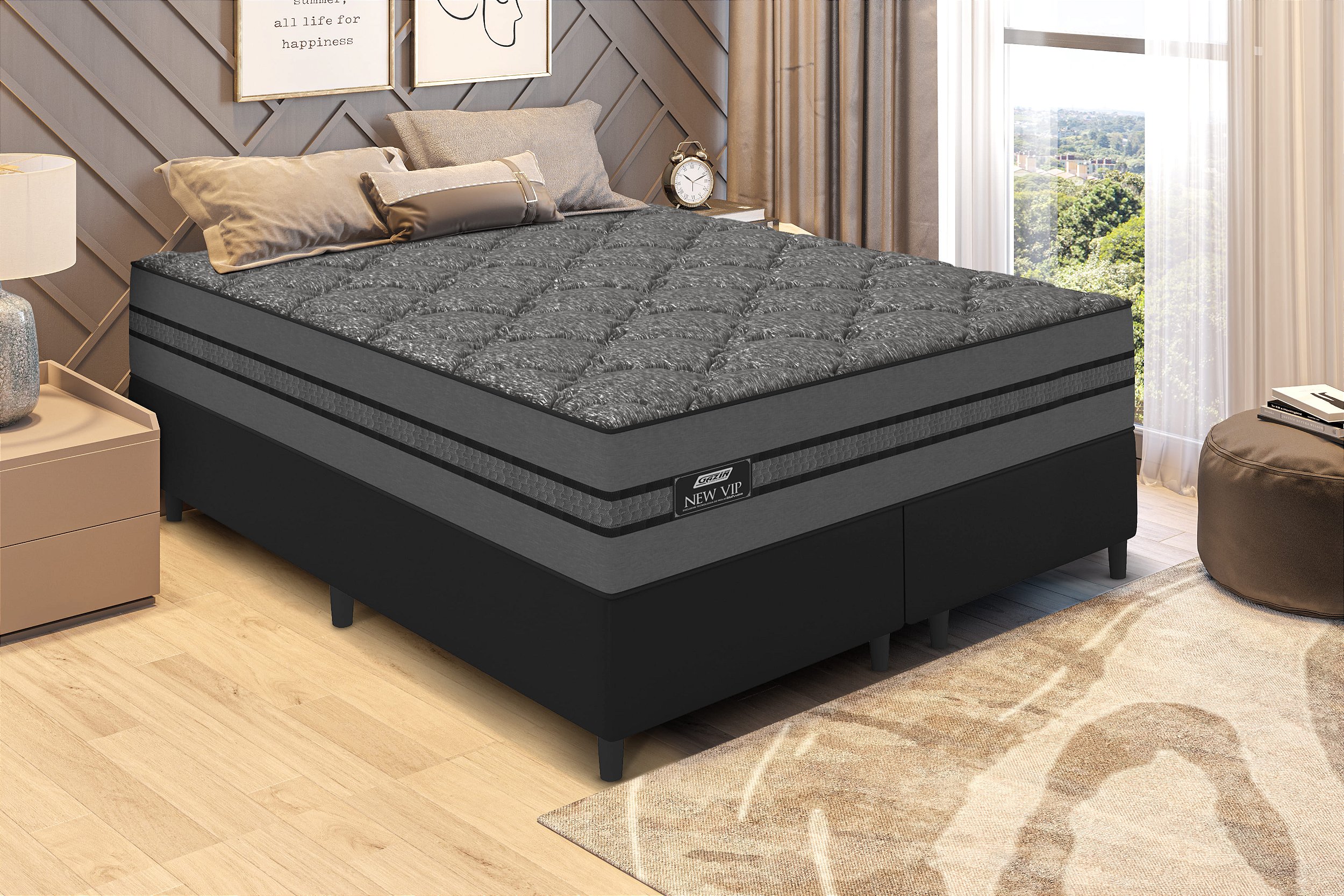 A tecnologia de Molas Ensacadas BlueWave garante independência dos movimentos, proporcionando um descanso silencioso e sem interrupções – perfeito para casais. Com um design moderno na cor preto/grafite, o New Vip traz sofisticação ao ambiente, aliado à qualidade reconhecida da marca Gazin.