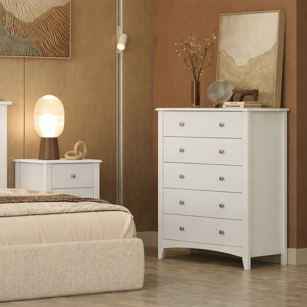 As 5 gavetas amplas oferecem excelente capacidade de organização, mantendo roupas e objetos sempre bem distribuídos e ao alcance. Os puxadores discretos reforçam a estética suave da peça, enquanto os 4 pés elevam o móvel, facilitando a limpeza e trazendo leveza ao conjunto.