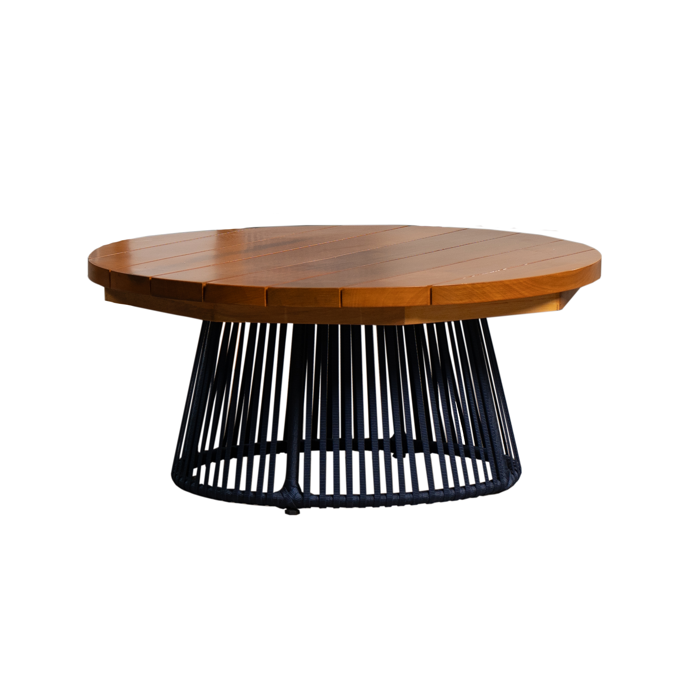 Sua estrutura em alumínio garante durabilidade e estabilidade, enquanto o tampo em madeira maciça adiciona calor e naturalidade ao ambiente. O grande destaque fica por conta da base entrelaçada em tricô náutico na cor azul, que cria um efeito visual moderno, artesanal e extremamente elegante.