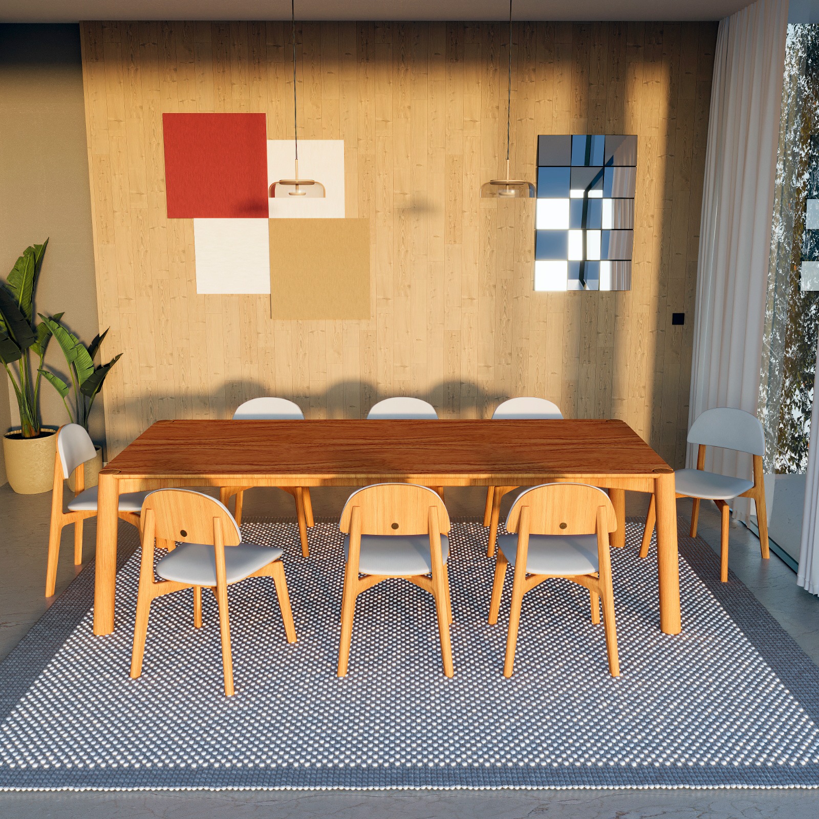 Seu tampo de MDF com 25 mm de espessura, laminado com lâmina natural de madeira Cinamomo, entrega um visual moderno e orgânico, destacando veios e texturas que valorizam o ambiente. Com dimensões generosas de 2,40 x 1,10 metros, é perfeita para salas de jantar amplas ou espaços corporativos que buscam imponência sem abrir mão da funcionalidade.