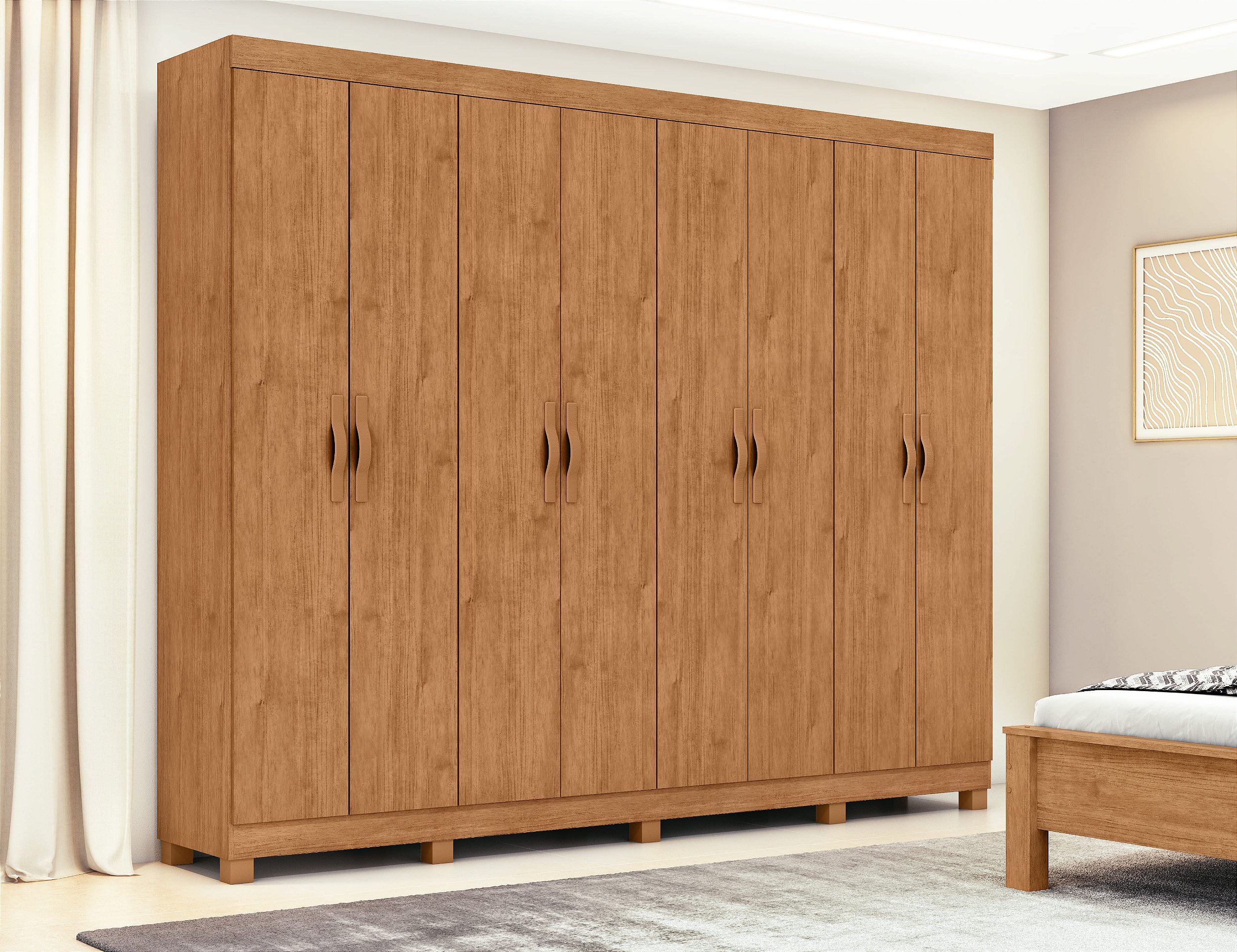 Seu grande diferencial está no espaço interno extremamente bem distribuído: são 8 portas, 6 gavetas, diversas prateleiras e divisões inteligentes que acomodam roupas longas e curtas com praticidade. As gavetas com corrediças telescópicas proporcionam abertura suave e segura, garantindo mais conforto e durabilidade.
