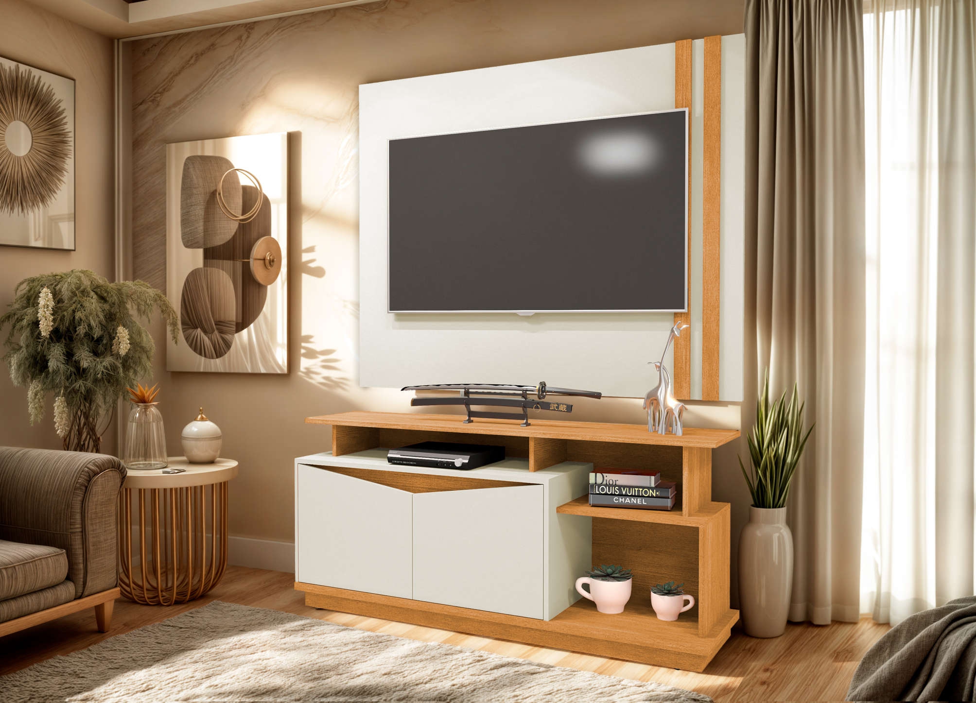 O Painel Noronha, leve e funcional, possui design contemporâneo que valoriza a decoração da sala. Suporta TVs de até 55 polegadas, com fixação segura e acabamento sofisticado em freijó e off white. Compacto e fácil de instalar, transforma o ambiente com elegância e praticidade.