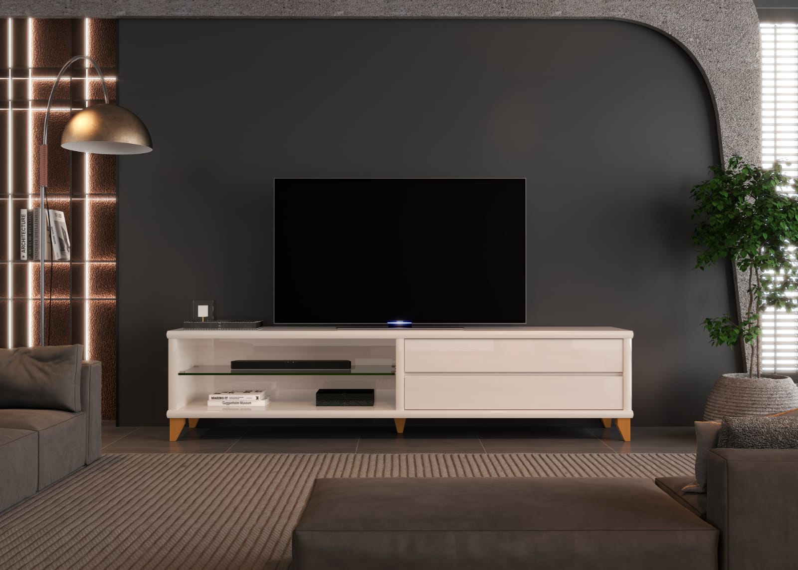O Rack EDN Vigo 1,80m é sinônimo de elegância e praticidade, ideal para quem deseja transformar a sala de estar em um espaço moderno e organizado. Com acabamento em off white e bordas laqueadas, acomoda TVs de até 75 polegadas, sendo perfeito para valorizar seu ambiente.