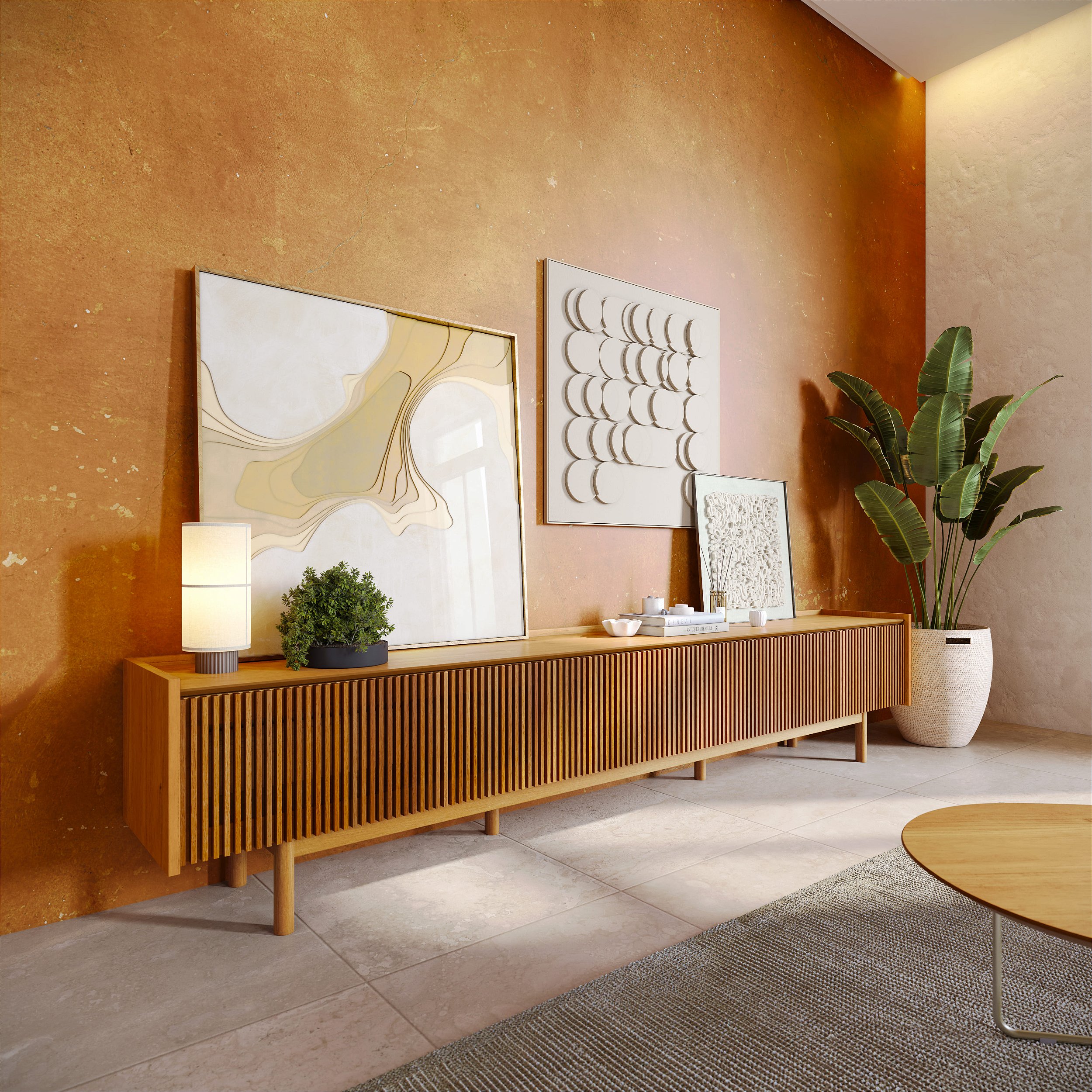 | Diferenciais | Design ripado elegante Pés e base em madeira maciça Acabamento sofisticado Estrutura reforçada |