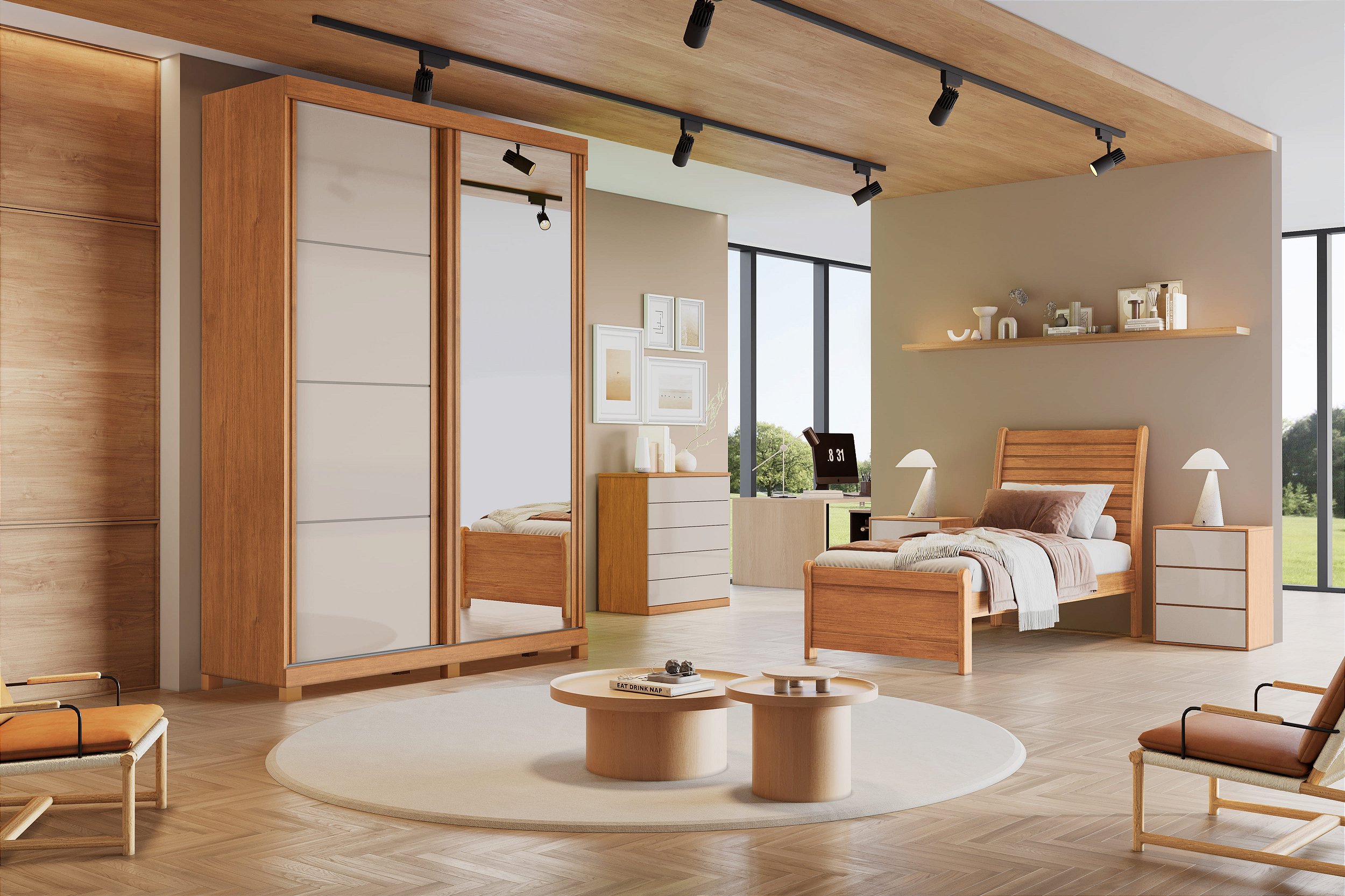 Produzido em 100% MDF, possui 2 portas de correr com puxadores em MDF, sendo uma com espelho inteiro com película de segurança. O espaço interno é amplo e bem dividido: são 8 prateleiras, 2 gavetas com corrediças telescópicas, cabideiros em alumínio e nicho organizador com 6 compartimentos, facilitando a organização de roupas, calçados e acessórios.