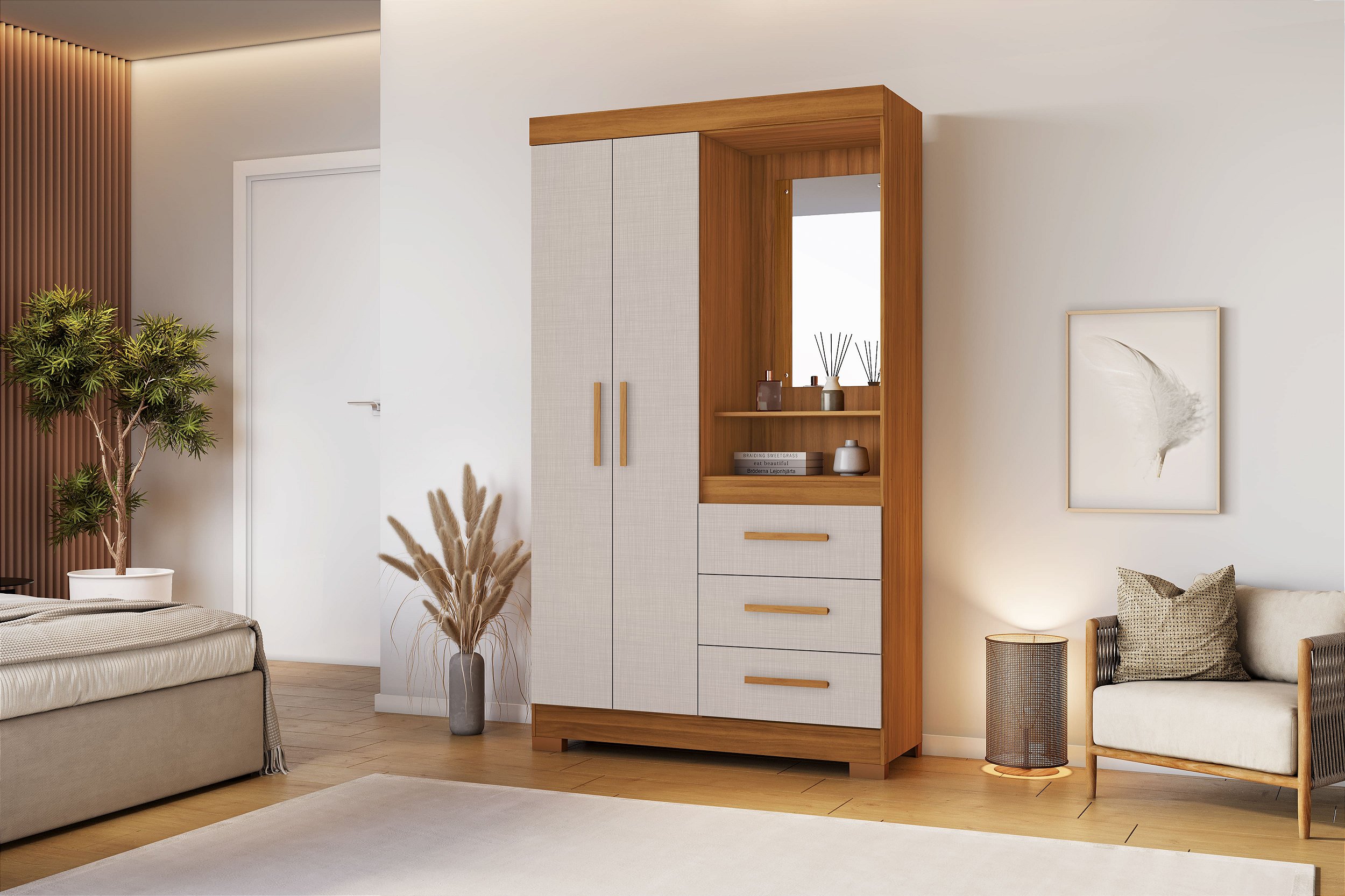 Conta com 2 portas articuladas, 3 gavetas com corrediças metálicas, 3 prateleiras internas e cabideiro com calceiro, garantindo espaço ideal para roupas, calçados e acessórios. Além disso, possui espelho de 3mm integrado, que agrega praticidade na escolha do look do dia a dia.