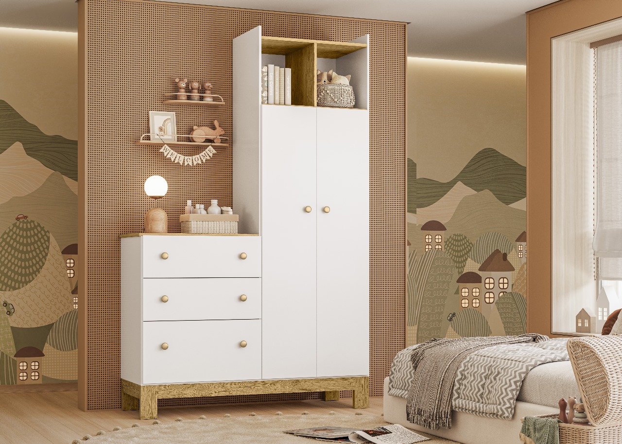 O Roupeiro Infantil Qmovi Flora com Cômoda foi pensado para quem busca praticidade sem abrir mão do design no quarto do bebê ou da criança. Com uma composição inteligente que une guarda-roupa e cômoda em um único móvel, ele otimiza o espaço e facilita a rotina, mantendo tudo sempre organizado e ao alcance.