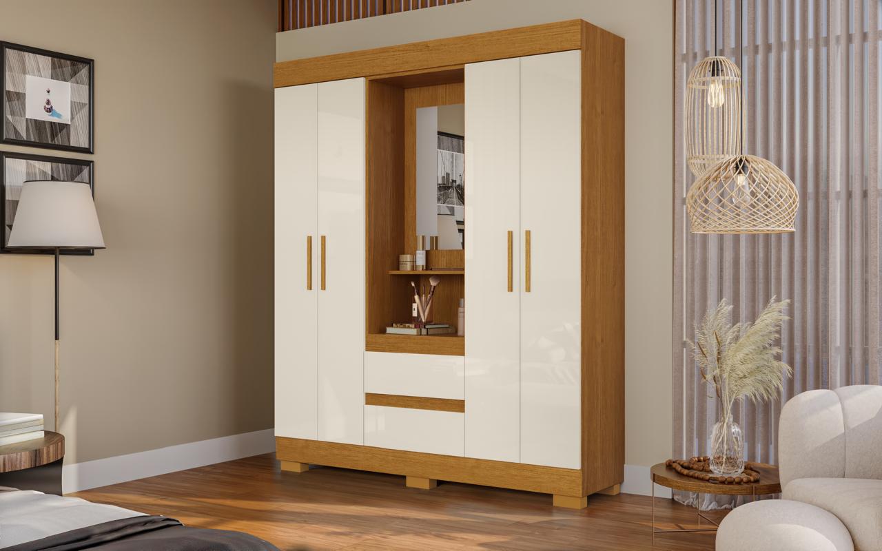 Sua estrutura foi pensada para unir resistência e funcionalidade: são 4 portas de abrir, 2 gavetas externas de fácil acesso e um layout interno inteligente com 6 prateleiras e cabideiros em alumínio, garantindo organização prática para roupas, acessórios e objetos do dia a dia.