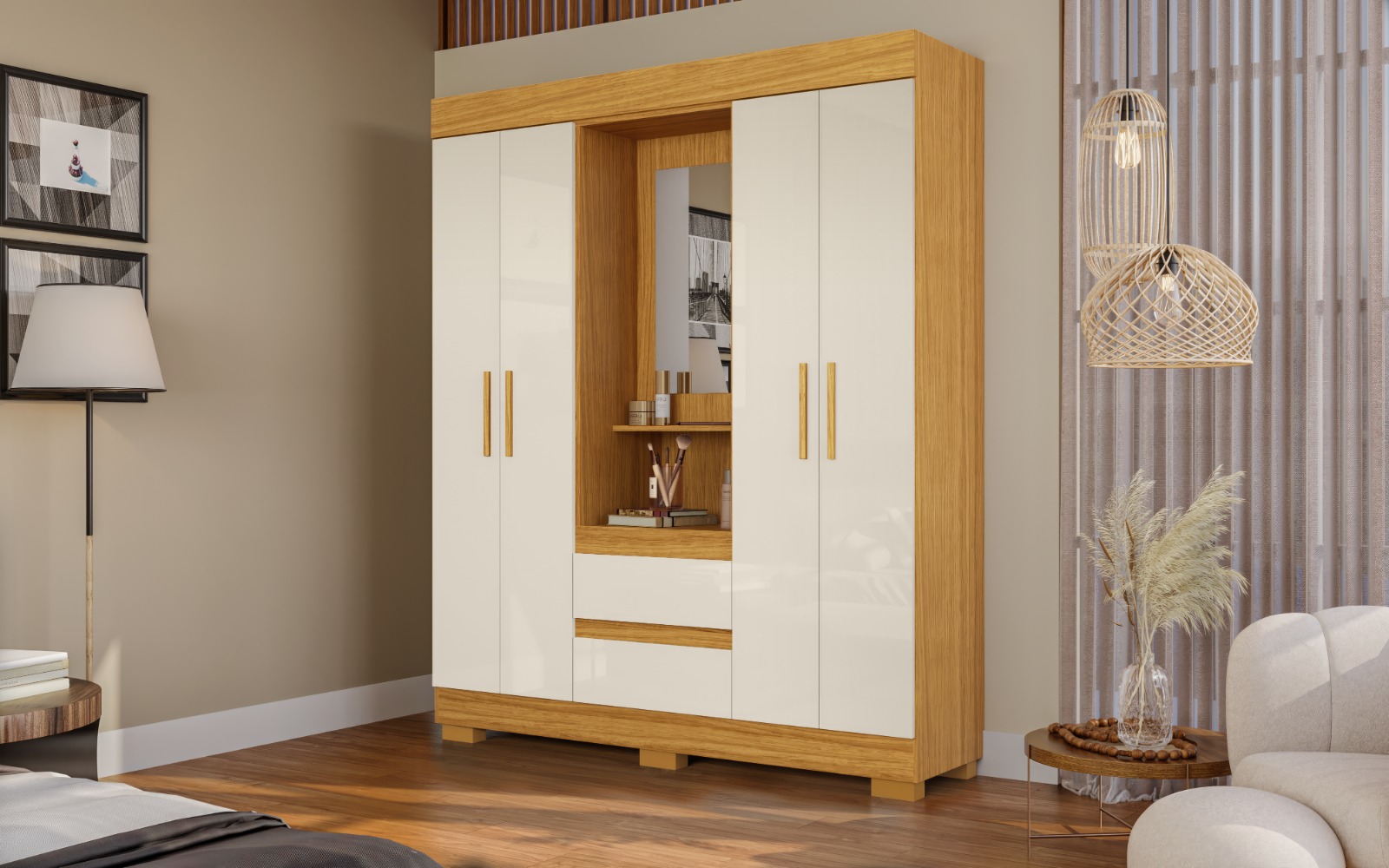 O guarda-roupa Isabely da ACP é um móvel que vai te encantar. Feito com todo cuidado em MDP, ele tem quatro portas com um design charmoso, lembrando uma capelinha, e ainda vem com uma penteadeira.