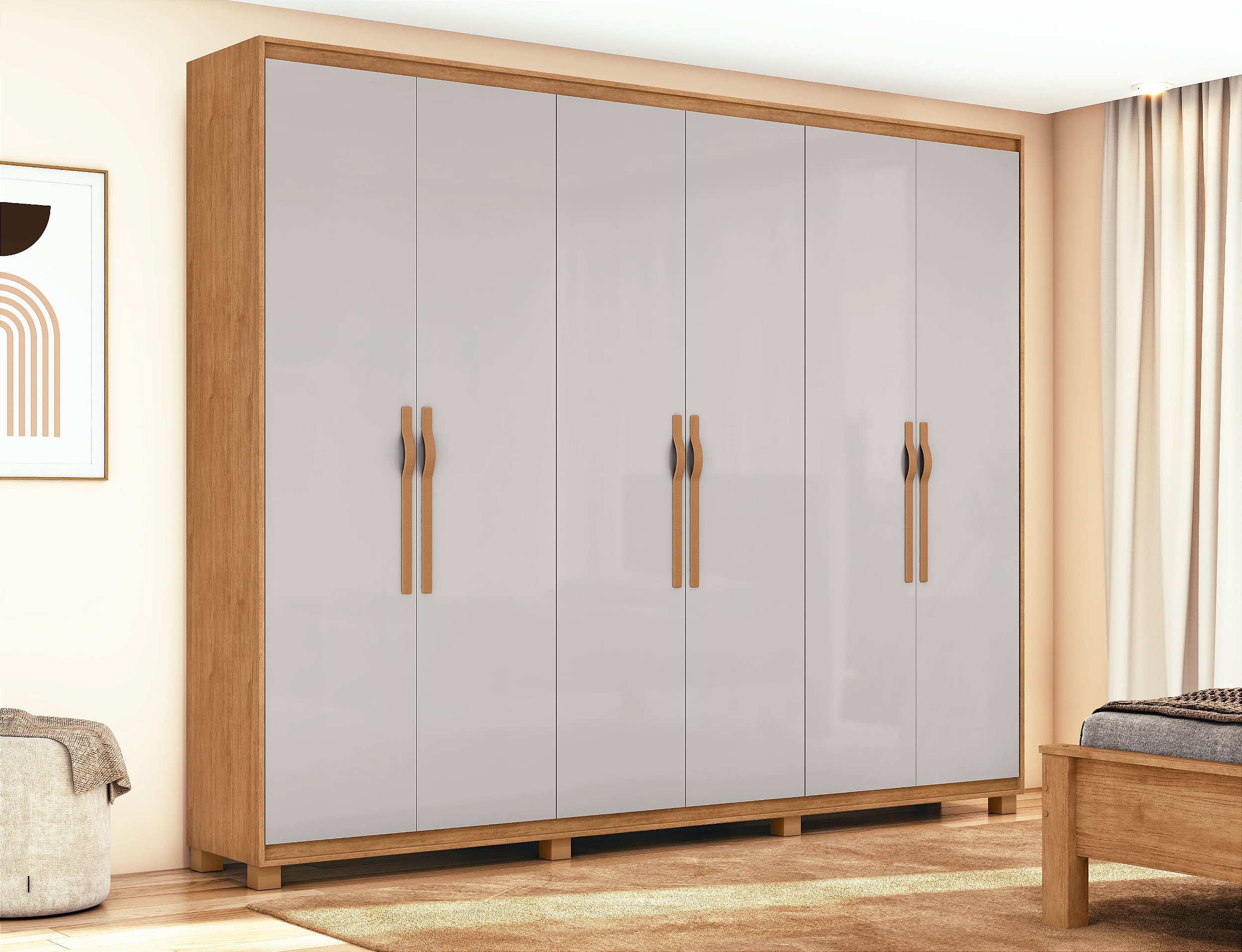 O roupeiro conta com 6 portas, com detalhes em baixo-relevo, que elevam o acabamento e trazem personalidade ao móvel. Os puxadores SoftFeel oferecem um toque confortável e um visual contemporâneo.