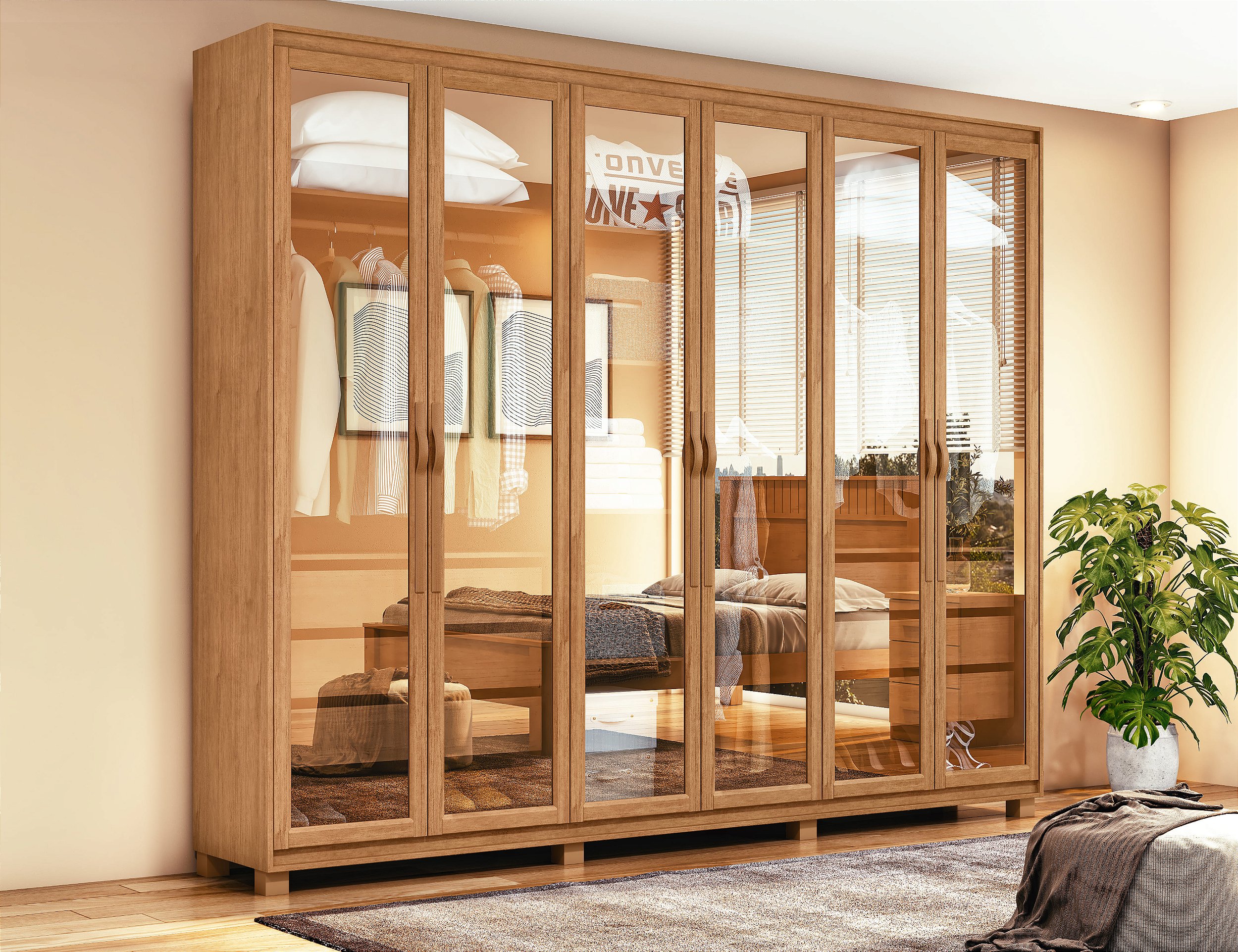 O roupeiro conta com 6 portas, com detalhes em baixo-relevo, que elevam o acabamento e trazem personalidade ao móvel. Os puxadores SoftFeel oferecem um toque confortável e um visual contemporâneo.