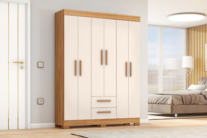 Com seis portas que revelam um amplo espaço interno, este guarda-roupa oferece praticidade para armazenar suas roupas, acessórios e objetos pessoais. Além disso, conta com duas gavetas equipadas com corrediças metálicas, garantindo um deslize suave e durabilidade ao longo do tempo.