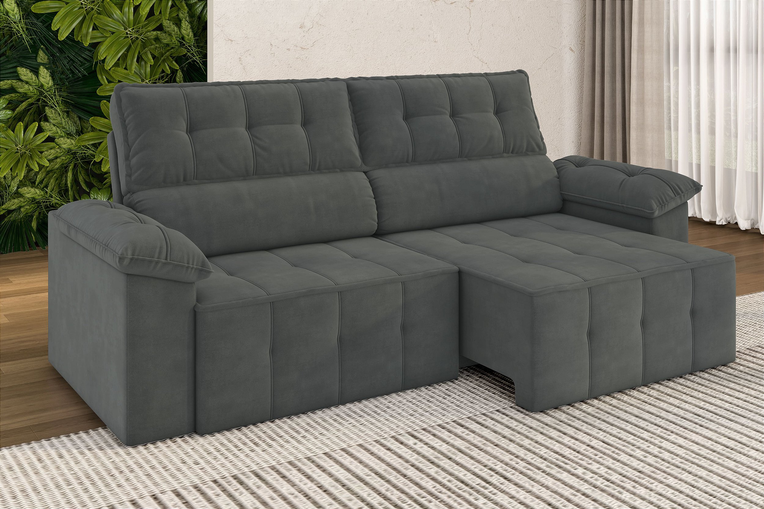 Revestido em tecido Slim na cor Titânio, combina elegância e fácil manutenção. A estrutura é reforçada com madeira de eucalipto e chapas OSB, garantindo durabilidade. Os assentos têm espuma D28, molas bonnel e percintas elásticas, proporcionando conforto e firmeza no uso diário.