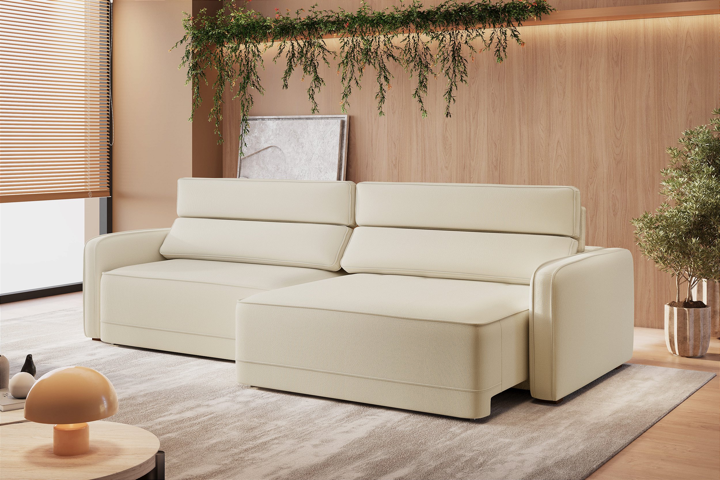 Com sistema retrátil e reclinável, o Bertha se adapta perfeitamente à sua rotina, oferecendo momentos de relaxamento sob medida. Quando fechado, mantém um visual organizado e funcional; quando aberto, transforma-se em um verdadeiro convite ao descanso, com profundidade ampliada de até 1,70m.